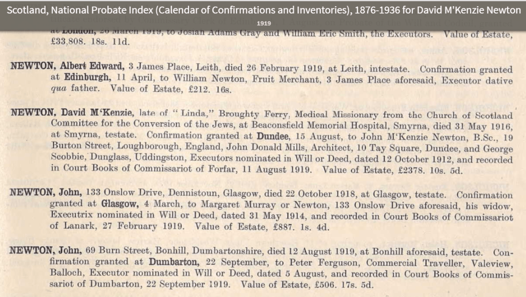 Late of “Linda,” Broughty Ferry, Medical Missionary from the Church of Scotland Committee, for the conversion of Jews, at Beaconsfield Memorial Hospital, Smyrna, Asia Minor, d. 31/05/1916 at Smyrna, testate. The value of the estate was ~£2,400 (thanks to the life insurance policies mentioned here in the archives).