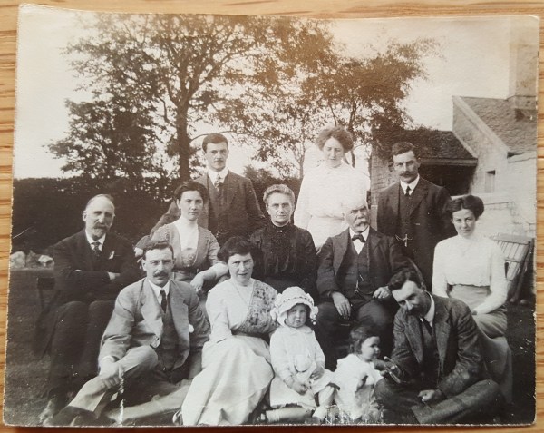 This Scottish summertime photograph, helpfully labelled on the back, celebrates the 35th (so-called coral) wedding anniversary of James Scobbie and Mina Laughland on July 3rd 1913, just before WW1. For photos from their diamond wedding celebrations in 1938 just before WW2 along with newspaper biographies, see the post on their diamond, gold and “ruby” anniversaries. A looming war is invisible in photographs like this, if we can resist the temptation to use hindsight to pour meaning into the expressions of the people in these gapless gatherings.