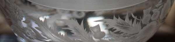 We have an antique vase from 1889. We didn’t know what it was, and more importantly we didn’t know who it was made for. Thanks to research then replies to this blog, the mysteries are solved (mostly). Wonderfully, we have heard from a descendant of the couple whose marriage it was made to commemorate (see below). The goblet is large (30cm tall with a 4 pint capacity) and beautifully engraved, with a floral thistle theme and pictorial images of Edinburgh Castle and the Palace of Holyrood House. The lead crystal rings like a bell when tapped. And it has two coins/medals inside a blown glass cavity (“knop”) at the foot of its stem.