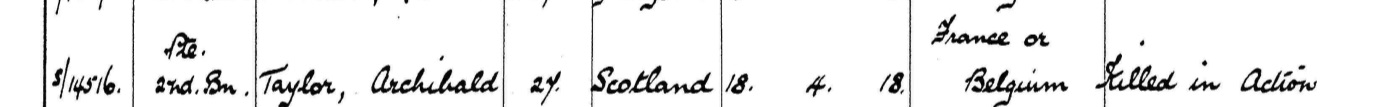 Charlotte’s Archibald Taylor, the right man (but in the wrong place at the wrong time, from their point of view), was service number S/14516 of the 2nd Battalion of the Seaforth Highlanders. He was killed in action probably in France near the border with Belgium on 18th April 1918, at the age of 25. He (i.e. his service number) was a little hard to find, because the age on the collated report and therefore his death record on Scotland’s People says he was 27.[6]