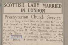 Presbyterian Church Service. A wedding which has an interest for many Aberdeenshire folk took place on Saturday in St Paul’s Presbyterian Church, South Croydon, when Mr John Russell, eldest son of Mr Thos. Russell of Lisburn, Married Miss Marjory Stevenson, daughter of Dr John Black Stevenson of Sanderstead, Surrey.