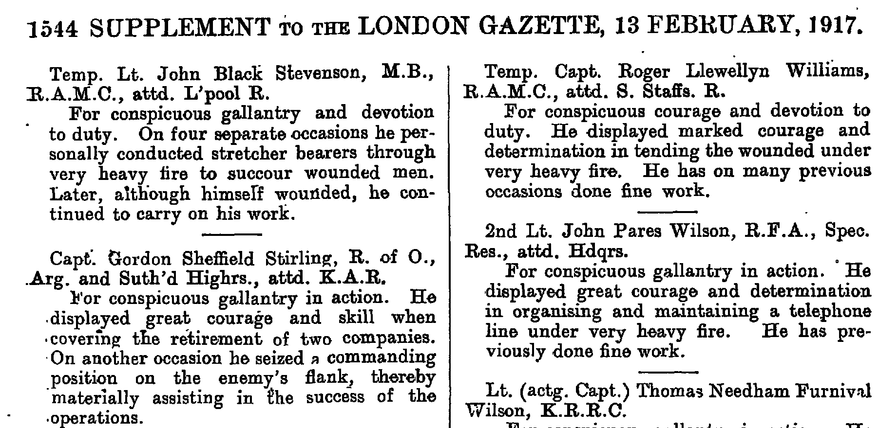 Temp. Lt. John Black Stevenson, M.B., R.A.M.C., attd. L’pool R. For conspicuous gallantry and devotion to duty. On four separate occasions he personally conducted stretcher bearers through very heavy fire to succour wounded men. Later, although himself wounded, he continued to carry on his work.”
