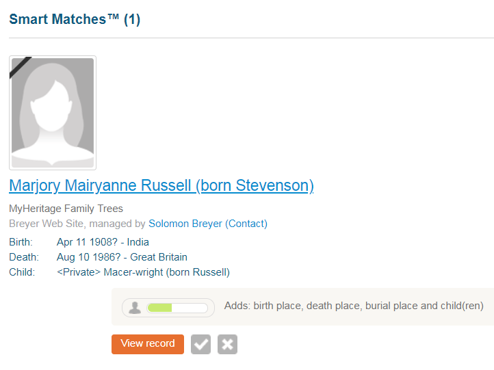 Recall that a GENI “smart match” links my Marjory to someone called Marjory Mairyanne Russell, born Stevenson in India (on 11/04/1908 with a “?”) and died in Great Britain on 10/08/1986? That’s looks like a HIT to me, despite the several discrepancies.