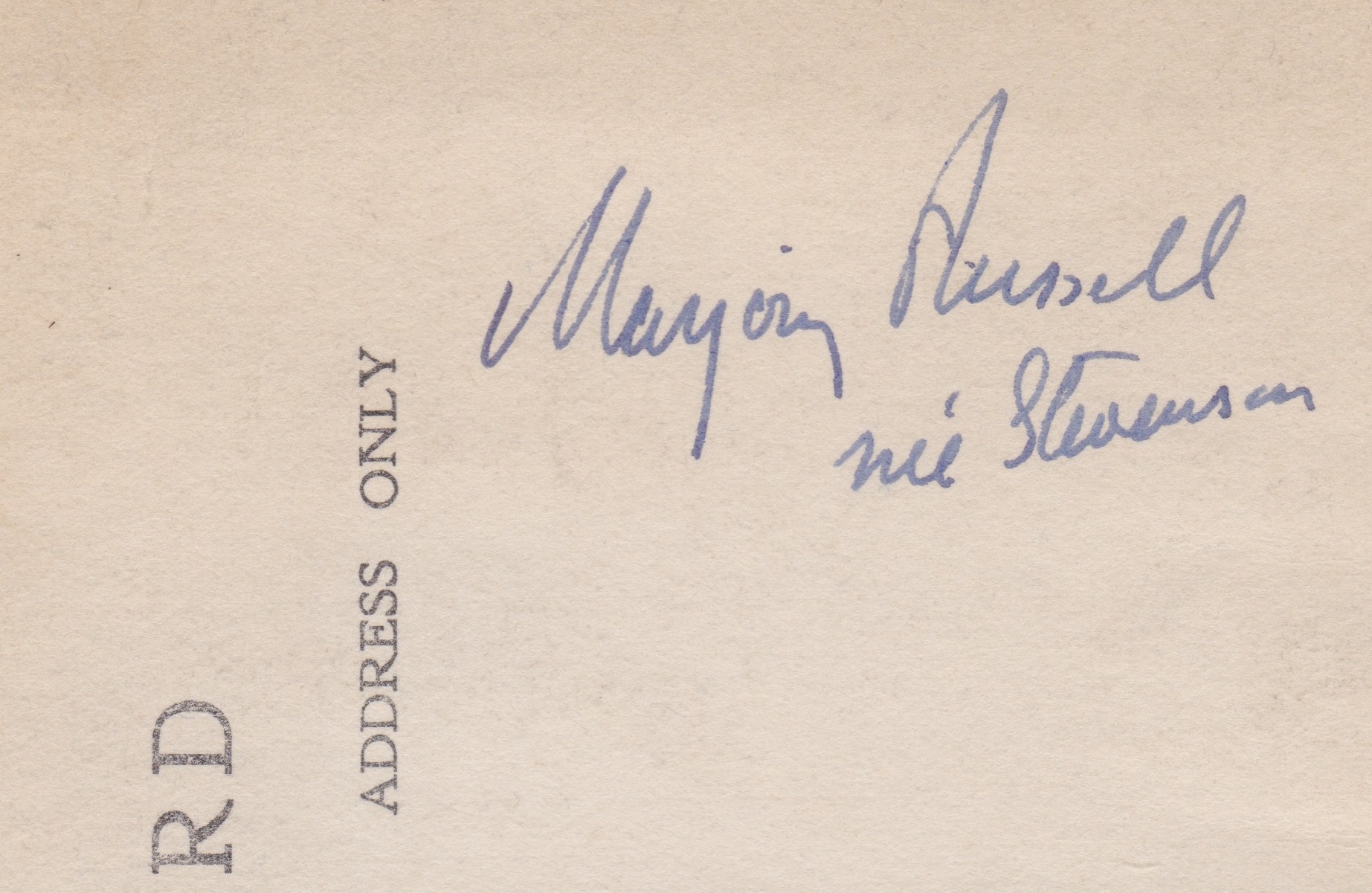 An undated printed postcard, unwritten. The reverse says, in my father’s handwriting, “Marjory Russell (nee Stevenson)”. I have been able to confirm that they were first cousins.
