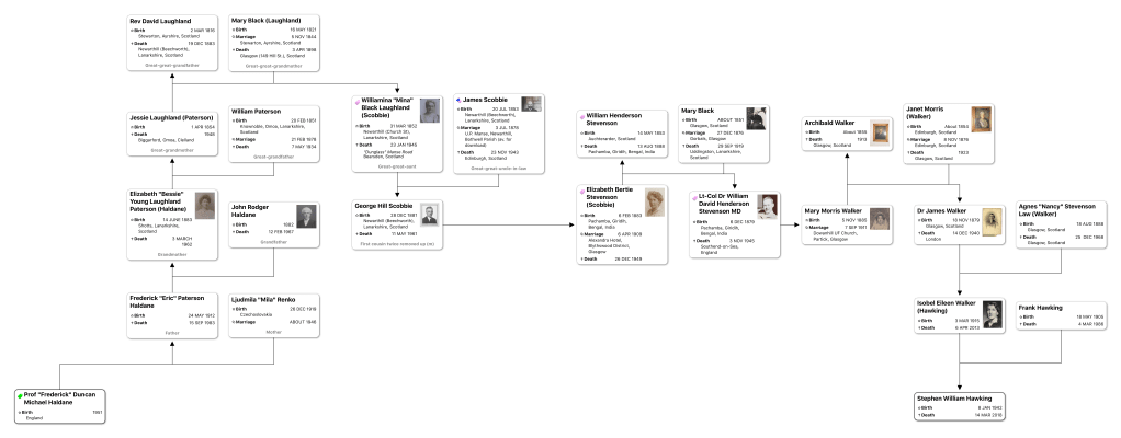 I learned of Haldane when internet searching the name of a 3rd cousin in 2017 on the internet, and then about Hawking via a fairly newly discovered 2nd cousin (in 2019) who knew him and had once been at a big Hawking family reunion. Turns out, Hawking was already on a public tree online, one which I’d already tentatively connected to. But I hadn’t even explored down to the leafs, where Hawking was lurking.