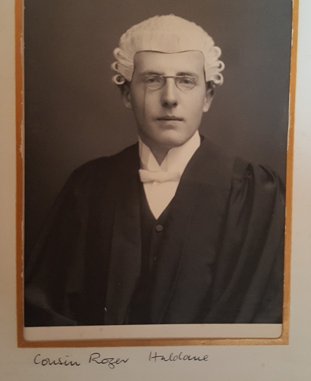 Duncan’s grandfather Sheriff Rodger Haldane is not a link in the story, but is worth mentioning. He had been familiar name to me for many years, having been referred to by my parents, and because his be-wigged photo was prominent and distinctive in an old family photo album (see below). The brief biographical note in Elizabeth Mitchell’s family tree says “Sheriff Substitute Ayr then Glasgow” which is still about the limit of my knowledge to date. For these reasons I mentioned him to my father-in-law (Glasgow solicitor Dr William Kinnis) many years ago, who knew of Rodger and his family. Sadly I can’t remember what my father-in-law said about the Haldanes or the extent of his own connection: but he did indeed also know who the Haldanes were.