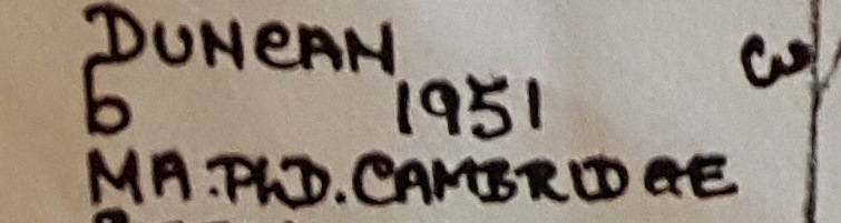 At the bottom edge of my father’s family tree, the one by Elizabeth Mitchell that has inspired me, the most recent entries were in her own and my father’s generation, plus a few children in my own generation, with a scattering of names or dates. There was a note about a Haldane child. Someone called Duncan, born 1951 (with a space left for the unknown day and month), and the detail “MA PhD Cambridge.” (I feel OK to discuss someone born <100 years ago since he is a public figure with more details than this already online.)