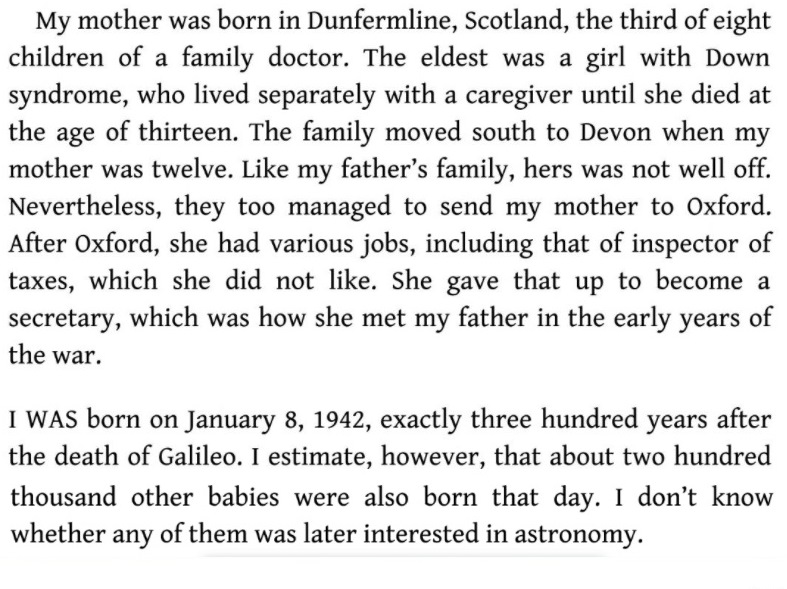 Hawking has written a short autobiography which has been well reused online, called “My Brief History” (2013). It has a page on his father’s family (bankrupted farmers), which I will not bother to repeat. He has somewhat less (only a paragraph) on his mother’s family, which I will quote below, to draw more attention to it.