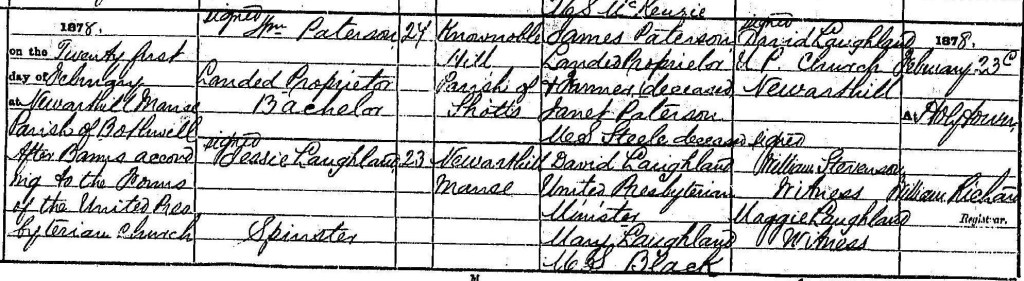 The Paterson-Laughland couple (Haldane’s great grandparents) were married on 21 Feb 1878 in Newarthill by the bride’s father, Rev. David Laughland, a United Free minister originally from Stewarton, Ayrshire. The marriage took place in Newarthill, a mining village in South Lanarkshire, in the Laughland family home, the manse in Church Street.