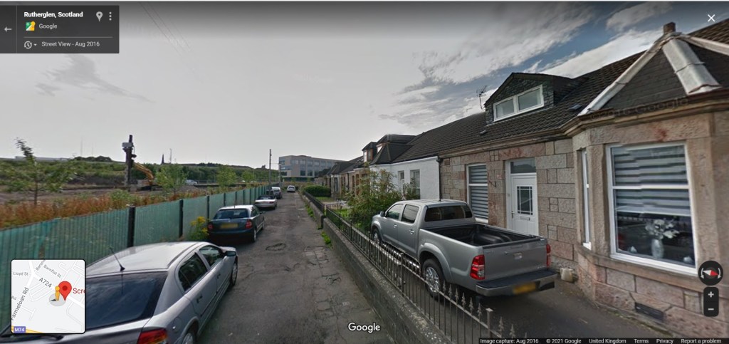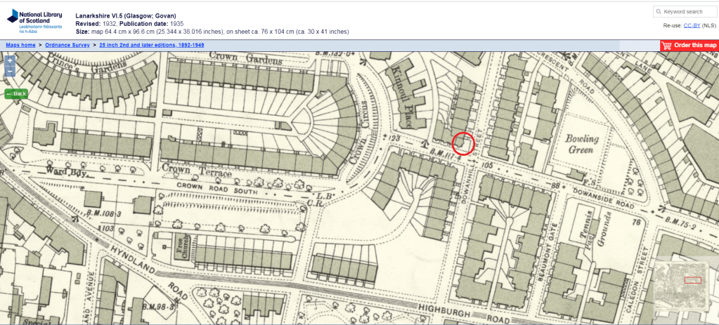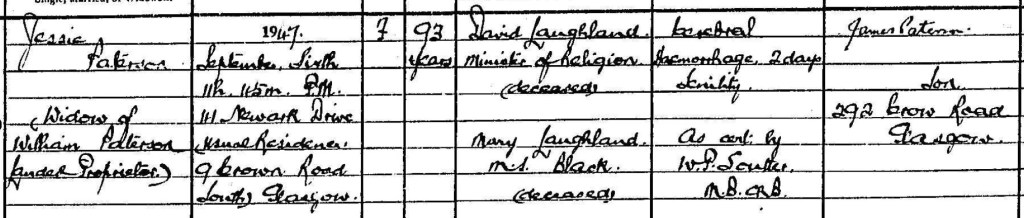 Haldane’s great grand-mother’s usual residence in the 1940s before her death aged 93 was 9 Crown Road South in Hyndland/Dowanhill. Her son James Paterson (1886-1970) was witness on her death certificate, and his home address was nearby, at 292 Crow Road, which is a tenement in Broomhill, a mile’s walk westwards. (Incidentally, it is also within sight of where I went to pre-school nursery, so he might have heard me girning in the street, if he still lived there in the 1960s.)
