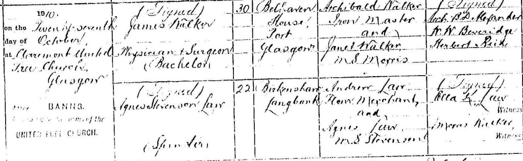 So, because of the name variation, I decided just to check the birth certificate. Right enough, her name at birth was recorded as “Eileen Isabel”, and she was born on March 3rd 1915 (not 8th November). Her father was recorded as James Walker, physician (presently Captain, Royal Army Medical Corps) and her mother as Agnes Stevenson Law, who had been married on the 27th October 1910 in Glasgow, matching the marriage certificate imaged above, and contradicting the GENi date.